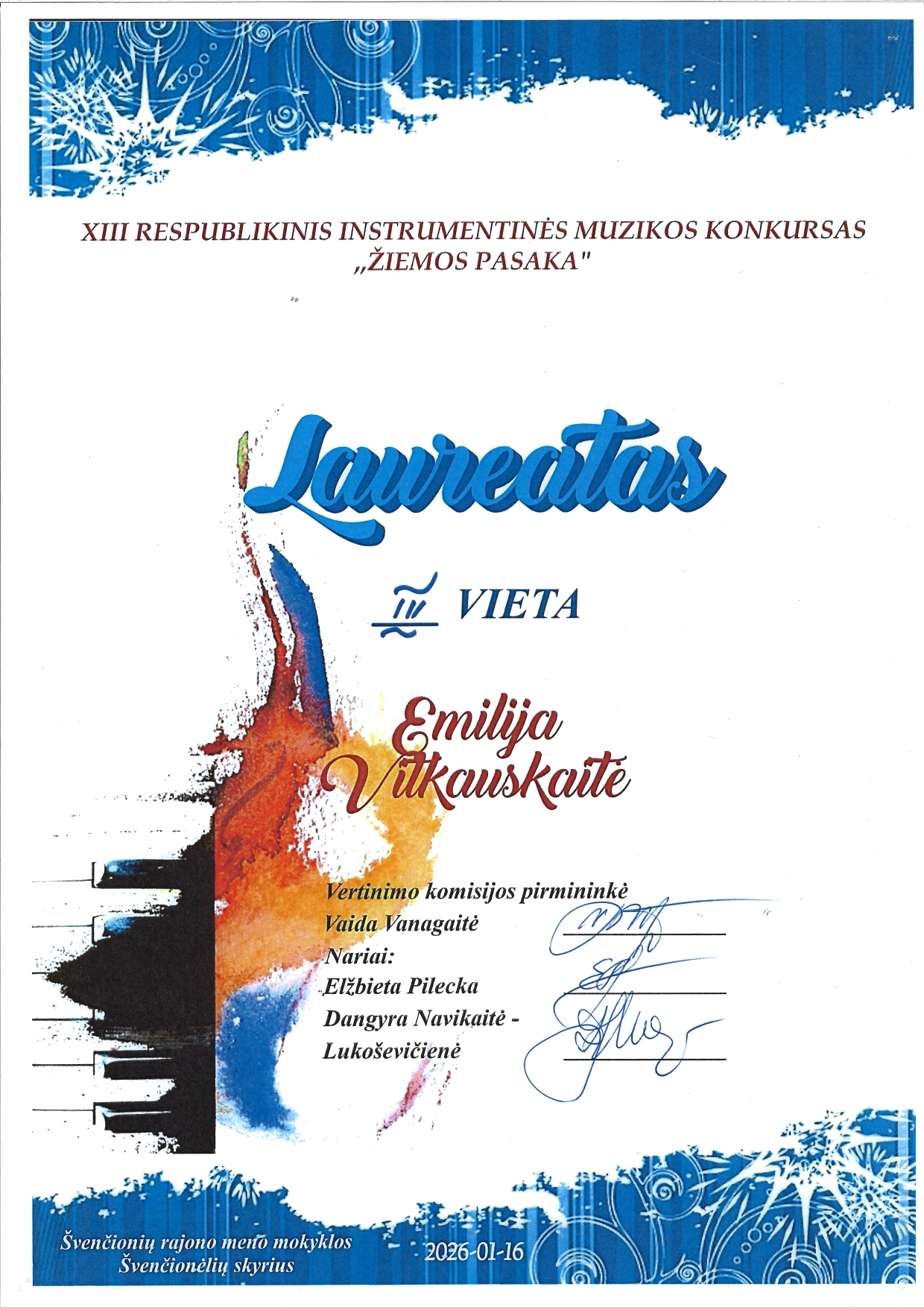 Skaityti2026 m. sausio 16 d. mokinės Elžbieta Sankauskaitė ir Emilija Vitkauskaitė sėkmingai atstovavo mokyklą XIII-ajame respublikiniame instrumentinės muzikos konkurse „Žiemos pasaka”, vykusiame Švenčionių rajono meno mokyklos Švenčionėlių skyriuje. Jaunosios atlikėjos buvo įvertintos ir pelnė po trečiąją vietą. Dėkojame mokytojai Liaudai Vaitkūnaitei – Ragauskienei už mokinių paruošimą konkursui ir linkime kūrybinės sėkmės.