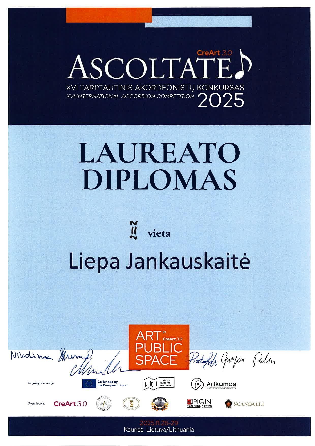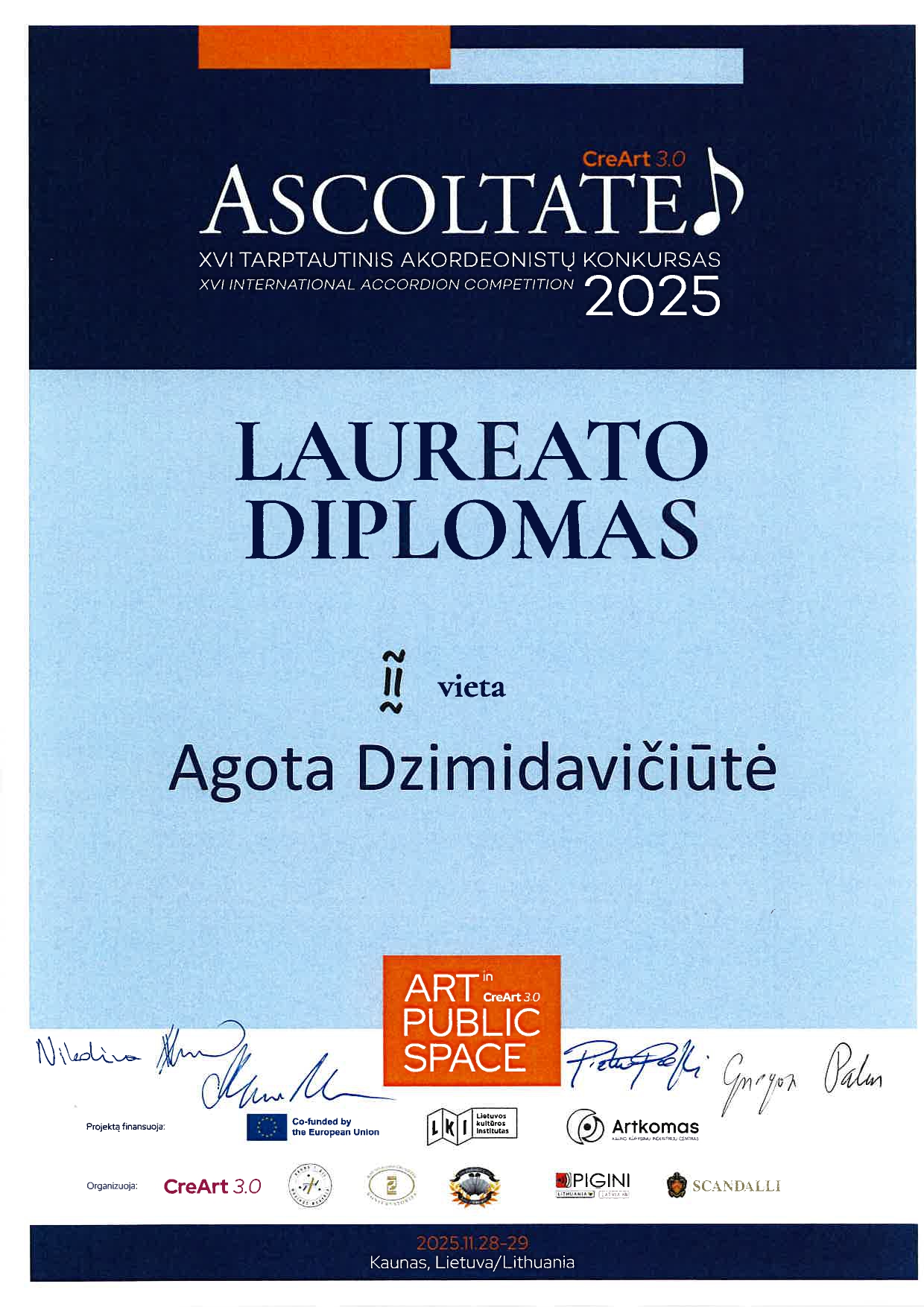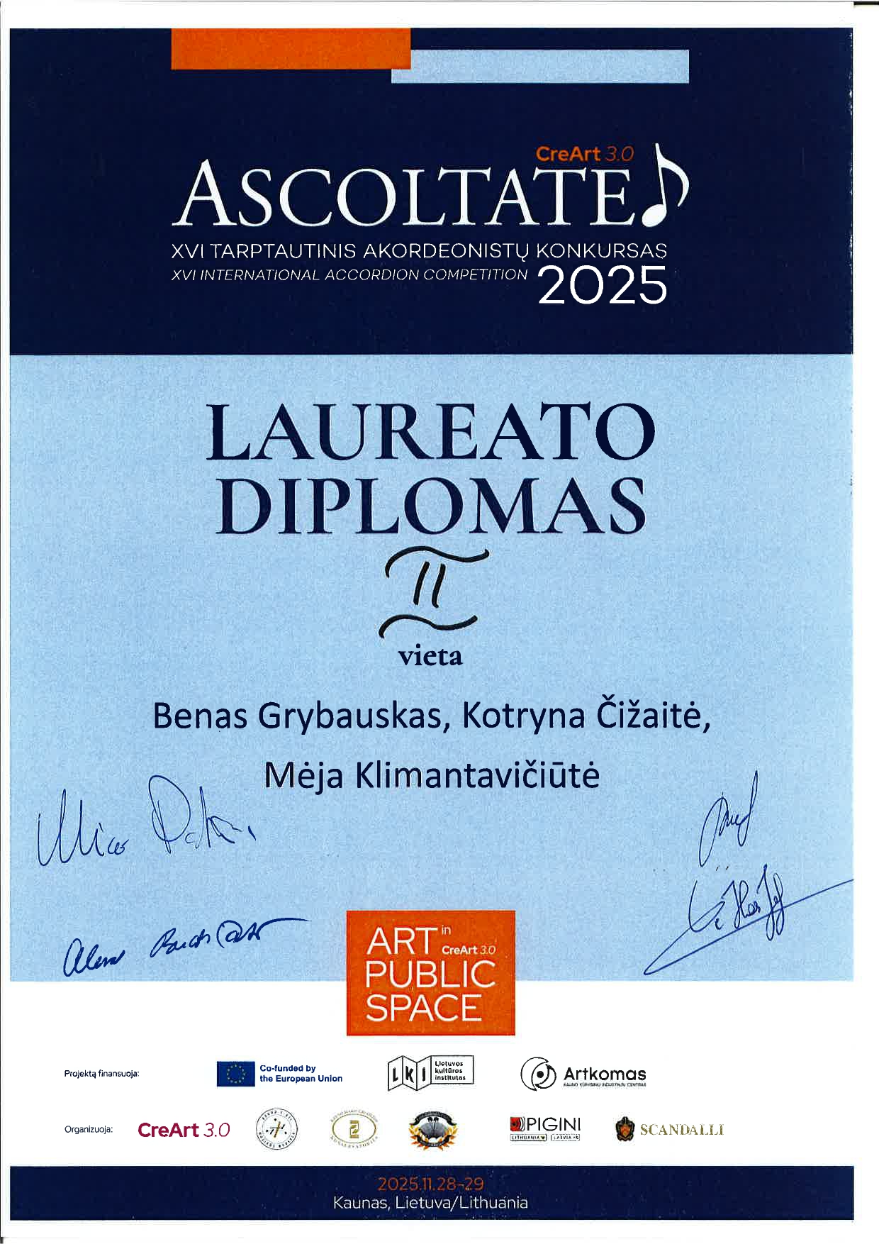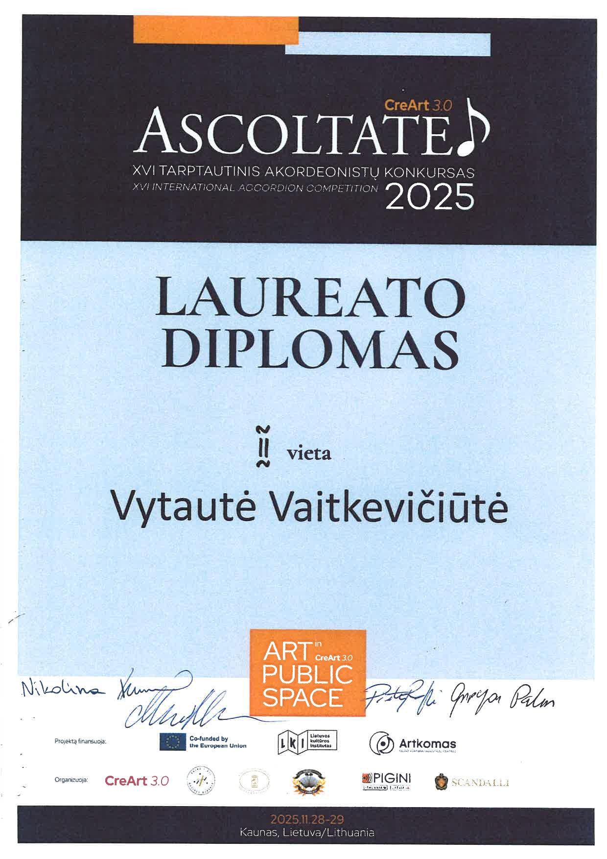 2025 m. lapkričio 28-29 dienomis Kauno J. Gruodžio konservatorijoje vyko XVI tarptautinis akordeonistų konkursas „Ascoltate 2025”. Šiame prestižiniame renginyje dalyvavo ir Vievio meno mokyklos akordeonistai: Agota Dzimidavičiūtė, Vytautė Vaitkevičiūtė,  Liepa Jankauskaitė, akordeonistų ansamblis: Benas Grybauskas, Mėja Klimantavičiūtė ir Kotryna Čižaitė (mokytoja S. Minkevičė).  Labai džiugu, kad jaunieji akordeonistai šauniai pasirodė savo amžiaus kategorijose. Visi buvo apdovanoti 2 vietos laureato diplomais bei puikiomis taurėmis.