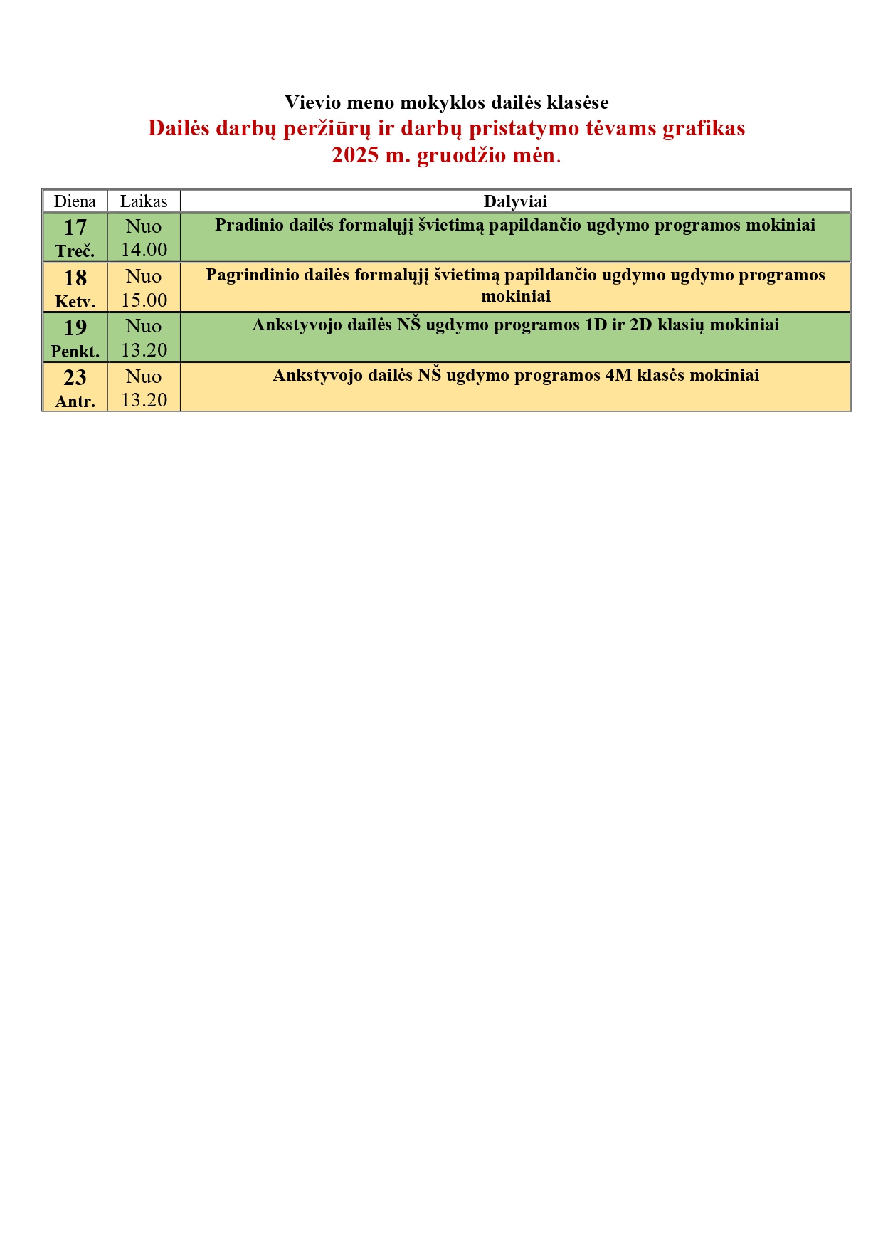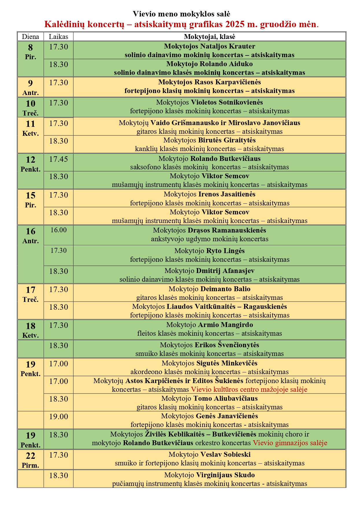Kalėdinių koncertų – atsiskaitymų grafikas 2025 m. gruodžio mėn.